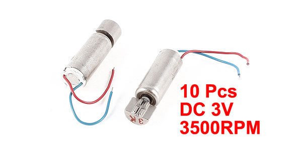 Product Name Coreless Vibration Motor Working Voltage DC 3V No Load Speed 3500RPM Body Size 6 x 21mm / 0.24" x 0.8" (D*H) Wire Length 2.5cm / 1" Total Length 4.5cm/ 1.8" Main Color Silver Tone Material Metal Weight 33g Package 10 x DC Coreless Vibration Motor - Reviews