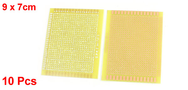 Product Name Universal PCB Board Hole Dia(Approx) 1mm / 0.04" Hole Pitch(Approx) 3mm / 0.12" Size(Approx) 9 x 7cm / 3.5" x 2.8"(L*W) Thickness(Approx) 1mm / 0.04" Color Yellow, Brown, Copper Tone Material Glass Fiber, Copper Net Weight 85g Package Content 10 x Universal PCB Board - Reviews
