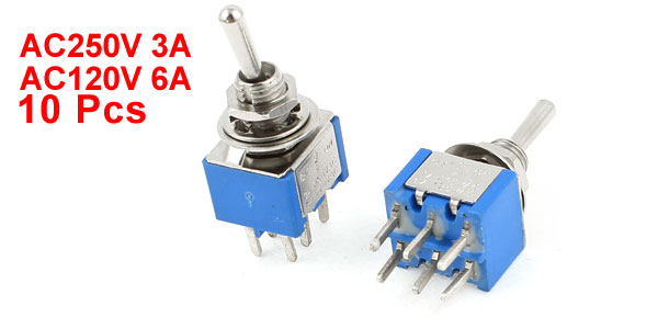 Product Name Toggle Switch Model MTS-203 Type DPDT(Latching) Position 3 Positions (ON/OFF/ON) Mounting Hole Diamter 6mm / 0.24" Voltage & Current AC250V, 3A, AC120V, 6A Main Body Size 13 x 12 x 9mm / 0.51" x 0.47" x 0.35"(L*W*H) Overall Height 35mm / 1.4" Material Metal & Resin Color Blue, Silver Tone Weight 59g Package Content 10 x Toggle Switches - Reviews