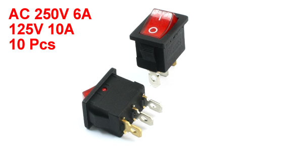 Product Name Rocker Switch Poles SPST(ON/OFF) Terminals 3 Pin Rated AC 250V 6A, 125V 10A Light Color Red Total Size 21 x 15 x 27mm / 0.8" x 0.6" x 1.1"(L*W*T) Mounting Size 19 x 12mm / 0.75" x 0.47"(L*W) Color Black, Red Material Plastic, Metal Net Weight 45g Package Content 10 x Rocker Switch - Reviews