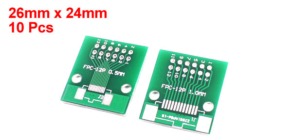 Product Name FPC/FFC-12P PCB Adapter Pin Pitch 0.5mm/0.02", 1mm/0.04" Fixing Hole Dia 3mm/0.12" Fixing Hole Center Distance 18mm/ 0.71" Body Size 26 x 24 x 1.6mm/1" x 0.94" x 0.06"(L*W*T) Material FR-4, Electronic Part Main Color Green Total Weight 13g Package Content 10Pcs x FPC/FFC-12P PCB Adapter - Reviews
