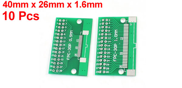 Product Name FPC/FFC-30P PCB Adapter Plate Pin Pitch 0.5/1.0mm, 2.54mm/ 0.1" Fixing Hole Dia 3mm/0.12" Fixing Hole Center Distance 34.5mm/ 1.4" Body Size 40 x 26 x 1.6mm/ 1.6" x 0.63" x 0.06"(L*W*T) Material FR-4, Electronic Part Main Color Green Total Weight 23g Package Content 10Pcs x FPC/FFC-30P PCB Adapter Plate - Reviews