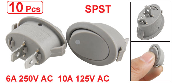 Product Name Rocker Switch Poles SPST Terminals 2 Pin (On - Off) Rating Voltage 6A 250V AC 10A 125V AC Total Size(Each One) 2.7 x 1.7 x 2.7cm / 1.1" x 0.7" x 1.1"(L * W * T) Mount Hole Size 2.2 x 1.3cm / 0.87" x 0.5"(L*W) Color Gray Material Plastic & Metal Total Weight 30g Package Content 10 x Rocker Switch - Reviews