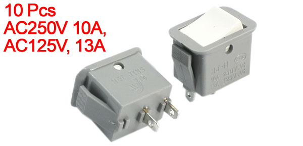 Product Name Rocker Switch Model MJ-11 Poles SPST Action Type Latching Terminals 2 Pin (On-Off) Rating Voltage AC250V 10A, AC125V, 13A Total Size(Each One) 19 x 12 x 20mm/ 0.75" x 0.47" x 0.8"(L*W*T) Mounting Size 18 x 11mm/ 0.71" x 0.43"(L*W) Body Color Gray Button Color White Material Plastic, Metal Weight 23g Package Content 10 x Rocker Switches - Reviews