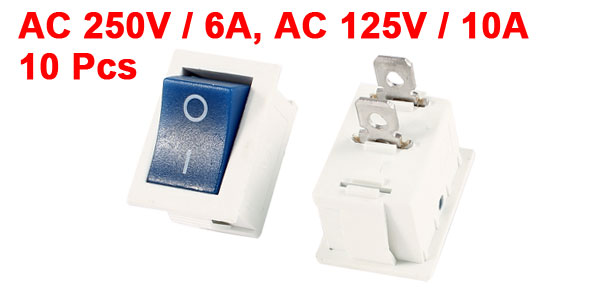Product Name Rocker Switch Material Plastic Model KCD1 Contact Pin 2 Pin Switch Type SPST Voltage / Current AC 250V / 6A, AC 125V / 10A Size 20 x 15 x 17mm / 0.8" x 0.6" x 0.7"(L*W*H) Color Blue, White Weight 34g Package Content 10 x Rocker Switches  - Reviews