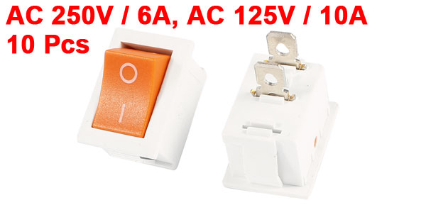 Product Name Rocker Switch Material Plastic Model KCD1 Contact Pin 2 Pin Switch Type SPST Voltage / Current AC 250V / 6A, AC 125V / 10A Size 20 x 15 x 17mm / 0.8" x 0.6" x 0.7"(L*W*H) Color Orange, White Weight 31g Package Content 10 x Rocker Switches - Reviews