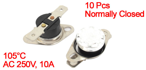 Product Name Temperature Control Switch Model.No KSD301 Action Type Normally Closed(NC) Action Temperature 105°C Voltage & Current AC 250V, 10A Total Size (Each) 34 x 18 x 12mm / 1.3" x 0.71" x 0.47"(L*W*H) Mounting Hole Size 4.5 x 3.5mm/0.18" x 0.14"(L*W) Material Metal, Plastic Color Black, Silver Tone Total Weight 47g Package Content 10 x Temperature Control Switches - Reviews