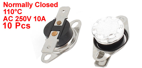 Product Name Temperature Control Switch Model.No KSD301 Action Type Normally Closed(NC) Action Temperature 110°C Voltage & Current AC 250V, 10A Total Size (Each) 34 x 18 x 12mm / 1.3" x 0.71" x 0.47"(L*W*H) Mounting Hole Size 4.5 x 3.5mm/0.18" x 0.14"(L*W) Material Metal, Plastic Color Black, Silver Tone Total Weight 47g Package Content 10 x Temperature Control Switches - Reviews