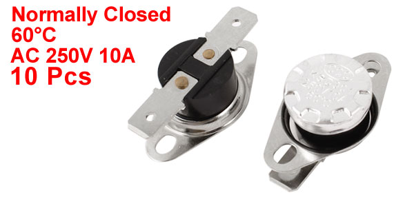 Product Name Temperature Control Switch Model.No KSD301 Action Type Normally Closed(NC) Action Temperature 60°C Voltage & Current AC 250V, 10A Total Size (Each) 34 x 18 x 12mm / 1.3" x 0.71" x 0.47"(L*W*H) Mounting Hole Size 4.5 x 3.5mm/0.18" x 0.14"(L*W) Material Metal, Plastic Color White, Silver Tone Total Weight 47g Package Content 10 x Temperature Control Switches - Reviews