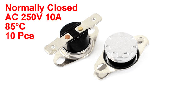 Product Name Temperature Control Switch Model.No KSD301 Action Type Normally Closed(NC) Action Temperature 85°C Voltage & Current AC 250V, 10A Total Size (Each) 34 x 18 x 12mm / 1.3" x 0.71" x 0.47"(L*W*H) Mounting Hole Size 4.5 x 3.5mm/0.18" x 0.14"(L*W) Material Metal, Plastic Color White, Silver Tone Total Weight 47g Package Content 10 x Temperature Control Switches - Reviews