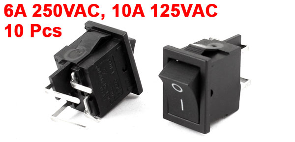 Product Name Rocker Switch Action DPST , Latching Terminals 4 Pin (O-I) Rating Voltage 6A 250VAC, 10A 125VAC Total Size 3 x 2.2 x 1.5cm/1.2" x 0.87" x 0.6"(L* W *T) Mounting Dimension 1.8 x 1.4 x 1.2cm/0.7" x 0.55" x 0.47"(L*W*T) Color Black, Silver Tone Material Plastic, Metal Total Weight 44g Package Content 10 x Rocker Switch - Reviews