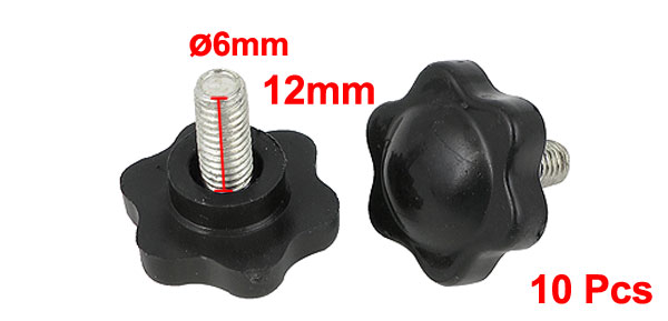 Product Name Clamping Knob Thread Hole Inner Dia. M6 Thread Length 12mm/ 0.47" Star Head Diameter 25mm/ 1" Total Height 23mm/ 0.9" Material Metal, Plastic Color Black, Silver Tone Weight 69g Package Content 10 Pcs x Clamping Knob - Reviews