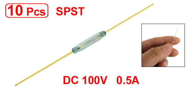 Product Name Reed Switch Model MKA-10110 Contact Type SPST (Form A) Max. Contact Rating 10W Max. Switching Voltage DC100V Min. Breakdown Voltage DC 220V Max. Switching Current 0.5A Max. Carry Current 1.0A Max. Initial Contact Resistance 100mΩ Min. Insulation Resistance 1010Ω Operate time 0.4ms Bounce time 0.4ms Release time 0.1ms Resonant Frequency 4000Hz Max. Operating Frequency 500Hz Pull in Value 10-15AT Min. Drop out Value 5AT Max. Contact Capacitance 0.7pF Test Coil Resistance 870Ω Glass Tube Size (Approx.) 1.7 x 9.8mm/ 0.067" x 0.385"(D*L) Lead Terminal Size(Approx.) 0.3 x 16mm/ 0.011" x 0.63"(D*L)(Each Side) Total Length (Approx.) 41.6mm/ 1.639" Color Gold Tone, Green Weight 3g Package Content 10 x Reed Switch - Reviews