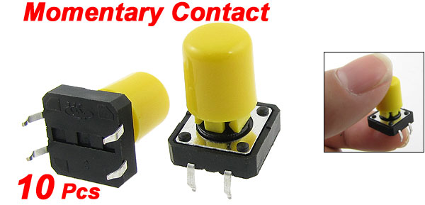 Product Name Tact Switch Contact Type Momentary Contact Size 12 x 12 x 16mm/0.47" x 0.47" x 0.63'' (L*W*H) Button Dia. 8mm/0.31'' Pin Pitch 14.5 x 4.5m/0.57'' x 0.18'' (L*W) Pin Length 4.5mm/0.18'' Material Plastic, Metal, Electric Parts Color Black, Yellow Net Weight 14g Package Content 10 x Tact Switch - Reviews