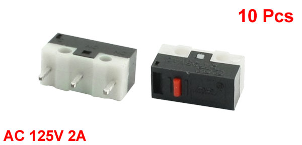 Product Name Micro Switch Model RW10 Voltage & Current AC 125V 2A Poles SPDT Contact Type 1NO + 1NC Actuator Type Push Button Terminal Type 3 Pin Terminals Overall Size(Pin not included) 13 x 6 x 6.3mm / 0.5" x 0.24" x 0.25" (L*W*H) Mounting Hole Dia. 2mm / 0.08" Mounting Hole Spacing 6mm/ 0.2" Pin Size 3 x 0.8mm/ 0.12" x 0.03"(L*W) Push Button Size 3 x 1mm / 0.12" x 0.04" (L*W ) Material Plastic, Metal Color Black, White Total Weight 6g Package Content 10 x Micro Switches - Reviews
