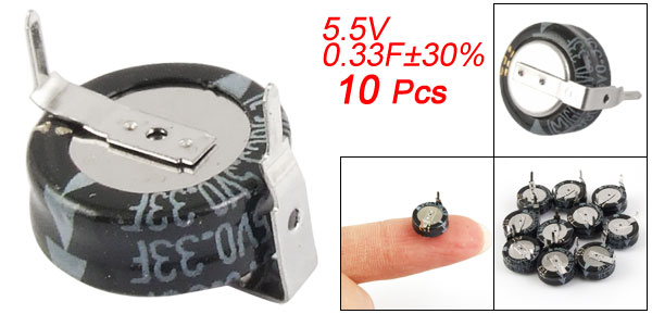 Product Name Super Capacitor Maximum Operating Voltage 5.5V Capacitance Value 0.33F Capacitance Tolerance ±30% Operating Temperature Range -25°C to +70°C ESR 75 Ω Terminal Type H Type Lead Type Radial Lead Mounting Type Through Hole Lead Sapcing 10mm / 0.39" Body Size (Approx.) 9.5 x 4mm / 0.37" x 0.16" (D*H) Total Height 9mm / 0.35" Weight 12g Package Content 10 Pcs x Coin Super Capacitors - Reviews