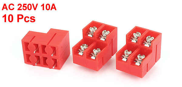 Product Name Screw Terminal Block Power AC 250V 10A Poles 4 Position Pin Number 4 Pin Pitch 8.5mm / 0.33" Total Size 24 x 18 x 18mm /0.94" x 0.7" x 0.7" (L*W*H) Color Red , Silver Tone Material Plastic Weight 71g Package Content 10 Pcs x Screw Terminal Block - Reviews