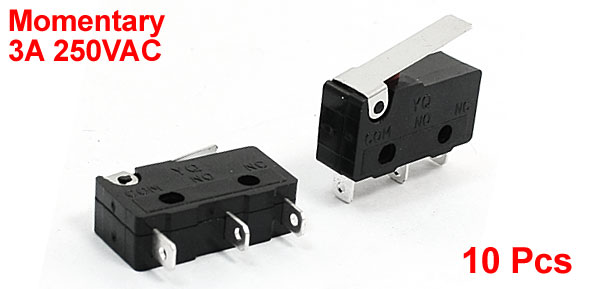 Product Name Micro Switch Action Type Momentary SPDT Contact Type 1NO 1 NC 1COM Actuator Type Short Hinge Lever Voltage/ Current 3A 250VAC Switch Body Size(Each) 2 x 1 x 0.7cm/0.78" x 0.4" x 0.3"(L*W*H) Lever Size 1.8x 0.4cm/0.7" x 0.16"(L*W) Hole Dia 2.2mm/0.09" Material Plastic & Metal Color Black & Silver Tone Net Weight 17g Package Content 10 x Micro Switch - Reviews