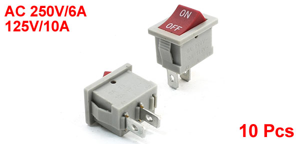 Product Name Rocker Switch Poles SPST Terminals 2 Pins (On-Off) Rating Voltage AC 250V/6A 125V/10A Total Size(Each One) 21 x 15 x 28mm/ 0.83" x 0.59" x 1.1"(L*W*T) Mounting Size 18 x 12mm/ 0.71" x 0.47"(L*W) Color Gray, Red Material Plastic, Metal Weight 37g Package Content 10 x Rocker Switch - Reviews