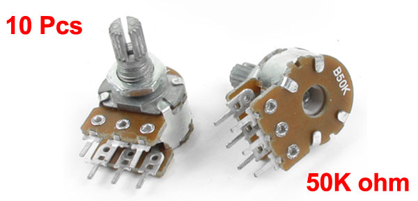 Product Name Potentiometer Resistance Value 50K ohm Adjustment Type Top Adjustment Type Linear Dual(Type B) Features Knurled Shaft Shaft Diameter 6mm / 0.24" Shaft Length 15mm / 0.6" Mounting Thread Diameter 7mm / 0.28" Base Height 11mm / 0.43" Base Diameter 17mm / 0.7" Material Metal w Electronic Parts Weight 71g Package 10 x Potentiometers - Reviews