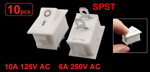 Product Name Rocker Switch Poles SPST Terminals 2 Pin (On - Off) Voltage 10A 125V AC 6A 250V AC Total Size(Each One) 2.1 x 1.5 x 2.5cm/0.8'' x 0.6'' x 1'' (L*W*T) Mounting Dimension 1.8 x 1.2 x 0.9cm/0.7'' x 0.5'' x 0.4'' (L*W*Depth) Color White Material Plastic & Metal Total Weight 30g Package Content 10 x Rocker Switch - Reviews