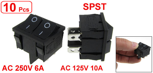 Product Name Rocker Switch Poles SPST Terminals 4 Pin (On-Off) Rating Voltage AC 250V 6A AC 125V 10A Total Size(Each One) 2.4 x 2 x 2.5cm/0.9" x 0.78" x 0.98"(L*W*H) Mounting Size 2.1 x 1.8 x 2cm/0.8" x 0.7" x 0.78"(L*W*H) Color Black Material Plastic, Metal Total Weight 72g Package Content 10 x Rocker Switch - Reviews