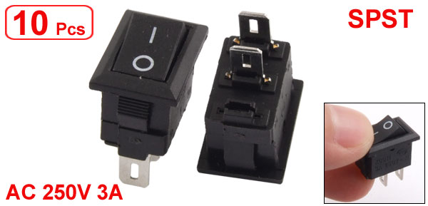 Product Name Rocker Switch Poles SPST Terminals 2 Pins Position On/Off Two Position Rated Voltage AC 250V 3A Overall Size 1.5 x 1 x 2cm / 0.59" x 0.39" x 0.79" (L*W*H) Mounting Size 1.3 x 0.8 x 1.5cm / 0.5" x 0.3" x 0.59" (L*W*H) Color Black, Silver Tone Material Plastic, Metal Total Weight 14g Package Content 10 x Rocker Switches - Reviews