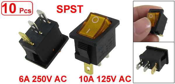 10pcs Yellow Neon Light ON-OFF I/O SPST Rocker Switch 3 Pin 6A/250V 10A/125V AC