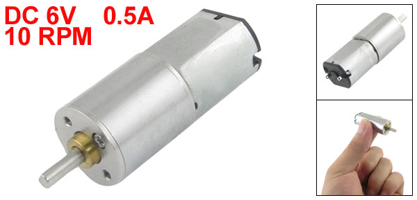 Product Name DC Geared Motor Rated Voltage DC 6V Rated Current 0.5A ( no load ) Speed 10 RPM Shaft Diameter 3mm/ 0.118" Gearbox Size 16 x 18mm/ 0.63" x 0.7" (D*H) Overall Size 16 x 49mm/ 0.63" x 1.92" (D*H) Main Color Silver Tone Material Metal Weight 24g Package 1 x DC Geared Motor - Reviews