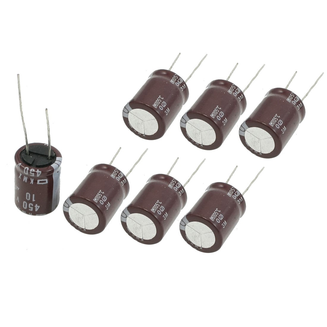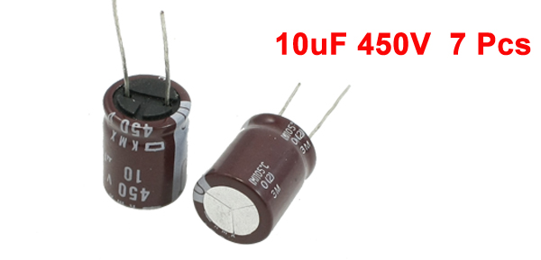 Product Name Aluminum Electrolytic Capacitor Type Radial Lead Maximum Temperature 105°C Voltage 450V Capacitance 10uF Capacitance Tolerance ±20% Size 16 x 55mm / 0.63" x 2.2" (D*L) Lead Spacing 7mm Lead Length 3.3cm/1.3", 2.3cm/0.9" External Material Aluminum Weight 46g Color Brown, Silver Tone Package Content 7 Pcs x Electrolytic Capacitors - Reviews