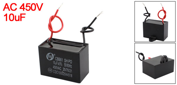 Product Name Capacitor Model CBB61 Rated Capacitance 10uF Tolerance ±5% Rated Voltage AC 450V Frequency 50/60Hz Operating Temperature 25/70/21 Body Size 4.8 x 3.5 x 2.7cm / 1.9" x 1.4" x 1.1"(L*W*T) Wire Length 8cm / 3" Main Material Polypropylene Film, PVC Main Color Black Weight 53g Package Content 1 x Capacitor - Reviews