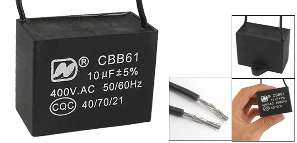 Terminal Wire Ambient Temperature 40/70/21 Rated Capacitance 10uF Tolerance +/-5% Rated Frequency 50/60Hz Rated Voltage 400V AC Size 4.6 x 3.5 x 2.5cm/1.8" x 1.4" x 1"(L*W*T) Wire Length 8cm/ 3.2" Install Bore Diameter 0.5cm/ 0.2‘ Main Color Black Weight 51g Package Content 1 x Motor Run Capacitor - Reviews