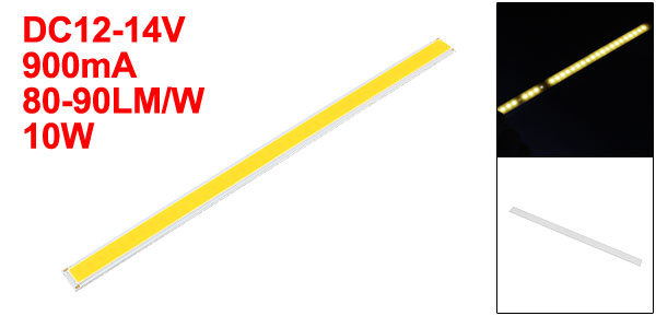 Product Name COB LED Lamp Beads Rated Voltage DC12-14V Luminous Flux 80-90LM/W Color Temperature 2800-3000K Power 10W Current 900mA Light Color Warm White Material Aluminum Color Silver Tone, Yellow Size 240 x 15mm/ 9.4" x 0.6" (L*W) Luminous Surface 238 x 10mm/ 9.3" x 0.4"(L*W) Weight 20g Package Content 1 x COB LED Lamp Beads - Reviews