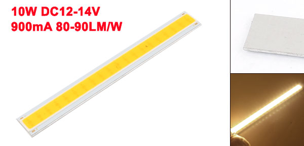 Product Name COB LED Lamp Beads Rated Voltage DC12-14V Luminous Flux 80-90LM/W Color Temperature 2800-3000K Power 10W Current 900mA Light Color Warm White Material Aluminum Color Silver Tone, Orange Size 120 x 15mm/ 4.7" x 0.6" (L*W) Luminous Surface 120 x 9mm/ 4.7" x 0.35"(L*W) Weight 9g Package Content 1 x COB LED Lamp Beads - Reviews