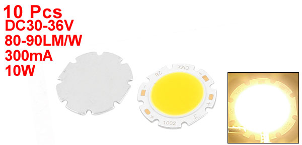 Product Name COB LED Lamp Beads Rated Voltage DC30-36V Luminous Flux 80-90LM/W Color Temperature 2800-3000K Power 10W Current 300mA Light Color Warm White Material Aluminum Color Silver Tone, Orange Diameter 28mm/ 1.1" Luminous Surface 20mm/ 0.8"(Diameter) Weight 22g Package Content 10 x COB LED Lamp Beads - Reviews