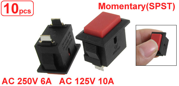 Product Name Push Button Switch Model KCD1-601 Type SPST (NO) Action Type Momentary Terminals 2 Pin Rating Voltage AC 250V 6A AC 125V 10A Total Size(Each) 21 x 15 x 21mm/ 0.9" x 0.6" x 1" (L*W*T) Mount Size 19 x 12 x 17mm/ 0.75" x 0.47" x 0.67" (L*W*Depth) Color Black Material Plastic & Metal Total Weight 33g Package Content 10 x Push Button Switch - Reviews