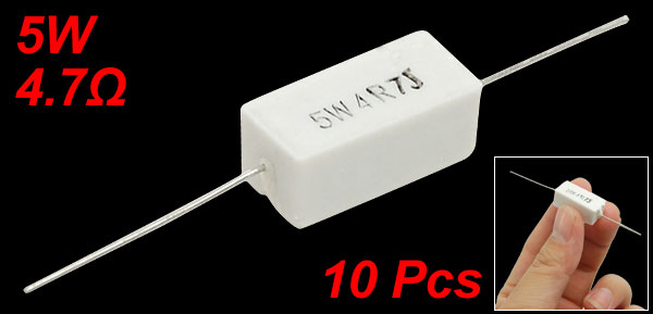 Product Name Cement Resistor Body Material Ceramic, Cement Power 5W Resistance 4.7Ω Tolerance ±5% Body Size (Approx.) 21 x 10 x 9mm / 0.83" x 0.39" x 0.35" (L*W*H) Lead Diameter (Approx.) 0.8mm / 0.031" Lead Length (Approx.) 26mm / 1" (Max.), 22mm / 0.87" (Min.) Color White Weight 42g Package Content 10 x Cement Resistors - Reviews