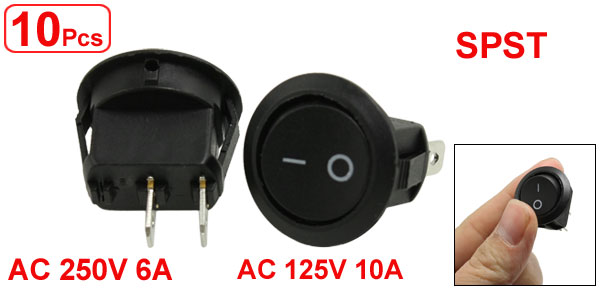 Product Name Rocker Switch Poles SPST Terminals 2 Pins Position On/Off Two Position Rated Voltage & Current AC 250V, 6A AC 125V, 10A Overall Size(Approx.) 23 x 29mm / 0.9" x 1.1" (Dia.*H) Mounting Size 19 x 11 x 10mm / 0.75" x 0.43" x 0.39"(L*W*Depth) Color Black Material Plastic, Electronic Parts TWeight 40g Package Content 10 Pcs x Rocker Switches - Reviews