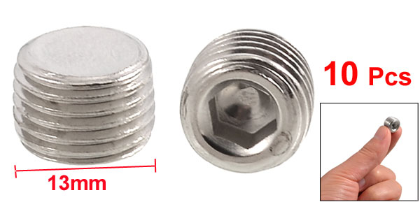 Product Name Hex Head Pipe Plug Color Silver Tone Material Metal Thread Diameter 13mm Thread Size 1/4" PT Hex Side to Side Diatance 6mm/ 0.23" High 9mm/ 0.35" Net Weight 64g Package Content 10 x Hex Head Pipe Plug - Reviews
