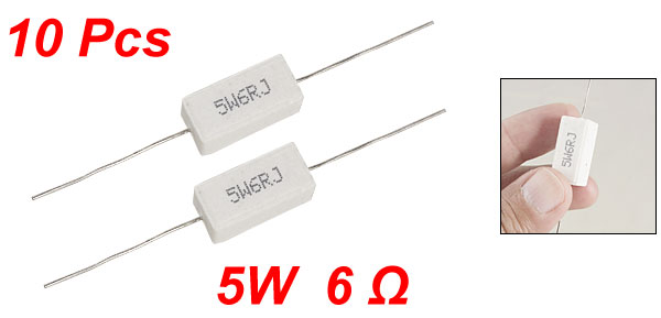 Product Name Cement Resistor Body Material Ceramic, Cement Power 5W Resistance 6Ω Tolerance ±5% (J) Body Size (Approx.) 22 x 10 x 9mm/0.86" x 0.39" x 0.35" (L * W * H) Lead Diameter (Approx.) 0.8mm/0.031" Color White Weight 47g Package Content 10 x Cement Resistors - Reviews