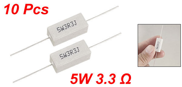 Product Name Cement Resistor Body Material Ceramic, Cement Power 5W Resistance 3.3KΩ Tolerance ±5% (J) Body Size (Approx.) 22 x 9 x 9mm/0.86" x 0.35" x 0.35" (L * W * H) Lead Diameter (Approx.) 0.7mm/0.027" Color White Weight 48g Package Content 10 x Cement Resistors - Reviews