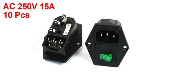 Product Name Power Socket Plug Type IEC320 C14 Voltage & Current 15A 250V AC Light Color Green Rocker Switch Type 3Pin SPST Fit Fuse Size 5 x 20mm/ 0.2" x 0.79" (L*W) Total Socket Size 5.8 x 4.8 x 3.3cm/2.3" x 1.9" x 1.3"(L*W*T) Mount Size 4.8 x 2.7cm/1.9" x 1"(L*W) Material (External) Plastic, Metal Main Color Silver Tone, Black Weight 261g Package Content 10 x Power Socket w Fuse Holder w Rocker Switch