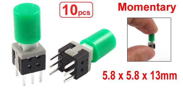 Product Name Tact Switch Contact Type Momentary Dimension 5.8 x 5.8 x 13mm / 0.23" x 0.23" x 0.51" (L*W*H) Button Cap Size 6 x 7mm / 0.23" x 0.27"(D*H) Pin Pitch 4 x 2mm / 0.16" x 0.08" (L*W) Pin Length 4mm / 0.16" Material Plastic, Metal, Electric Parts Color Black, White, Gray, Green Net Weight 6g Package Content 10 x Tact Switch w Cap - Reviews
