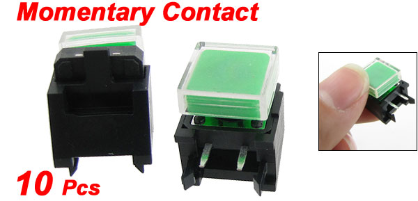 Product Name Tact Switch Contact Type Momentary Contact Dimension 12 x 12 x 9mm / 0.47" x 0.47" x 0.35" (L*W*H) Button Size 12 x 12 x 6mm / 0.47" x 0.47 x 0.24" (L*W*H) Pin Pitch 5 x 6mm / 0.2" x 0.24" (L*W) Pin Length 5mm / 0.2" Base Size 18mm x 13mm x 9mm / 0.7" x 0.5" x 0.35" (L*W*H) Material Plastic, Metal, Electric Parts Color Black, Silver Tone, Clear, Green Net Weight 17g Package Content 10 Pcs x Tact Switches - Reviews