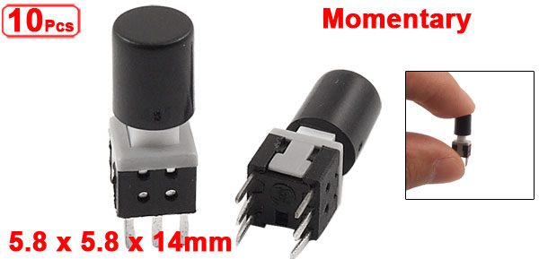 Product Name Tact Switch Contact Type Momentary Contact Dimension 5.8 x 5.8 x 14mm / 0.27" x 0.27" x 0.55" (L*W*H) Button Dia. 5mm / 0.2" Pin Pitch 4 x 1.2mm / 0.16" x 0.05" (L*W) Pin Length 3.1mm / 0.12" Material Plastic, Metal, Electric Parts Color White, Black, Gray Net Weight 5g Package Content 10 x Tact Switches - Reviews