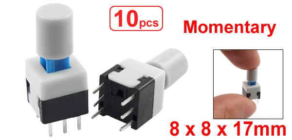 Product Name Tact Switch Contact Type Momentary Dimension 8 x 8 x 17mm / 0.31" x 0.31" x 0.67" (L*W*H) Button Cap Size 6 x 7mm / 0.23" x 0.27"(D*H) Pin Pitch 5.5 x 2.5mm / 0.22" x 0.1" (L*W) Pin Length 4mm / 0.16" Material Plastic, Metal, Electric Parts Color Black, Gray, Blue Net Weight 8g Package Content 10 x Tact Switch w Cap - Reviews
