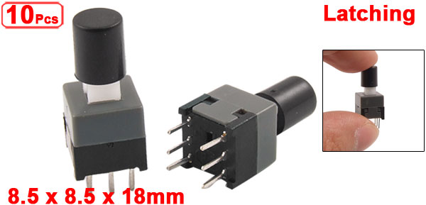 Product Name Tactile Switch Contact Type Latching Dimension 8.5 x 8.5 x 18mm / 0.33" x 0.33" x 0.7" (L*W*H) Button Cap Size 6 x 7mm / 0.23" x 0.27"(D*H) Pin Pitch 5 x 2.5mm / 0.2" x 0.098"(L*W) Pin Length 4mm / 0.16" Material Plastic, Metal, Electric Parts Color Black, Gray Net Weight 9g Package Content 10 x Tactile Push Switch - Reviews