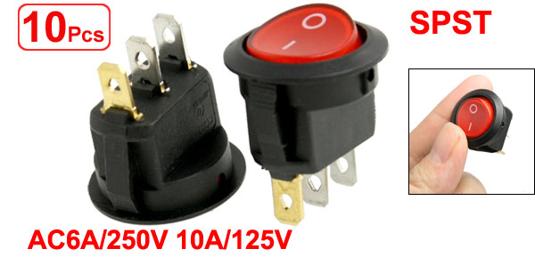 Product Name Rocker Switch Poles SPST Terminals 3 Pin (On - Off) Rating Voltage 6A 250V AC 10A 125V AC Lamp Voltage AC 220V Total Size(Each One) 23 x 29mm / 0.9" x 1.14"(D*H) Fixing Hole Size 19.6 x 23mm / 0.77" x 0.9"(D * H) Color Black, Red Material Plastic & Metal Total Weight 48g Package Content 10 x Rocker Switch - Reviews