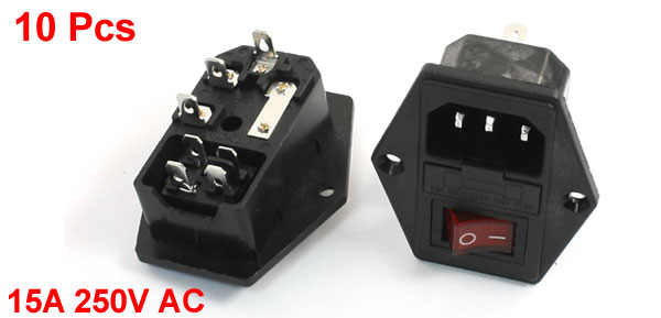 Product Name Power Socket Plug Type IEC320 C14 Voltage & Current 15A 250V AC Light Color Red Rocker Switch Type 4Pin DPST Fit Fuse Size 5 x 20mm/ 0.2" x 0.79" (L*W) Total Socket Size 5.8 x 4.8 x 3.3cm/2.3" x 1.9" x 1.3"(L*W*T) Mount Size 4.8 x 2.7cm/1.9" x 1"(L*W) Material (External) Plastic, Metal Main Color Silver Tone, Black Weight 262g Package Content 10 x Power Socket w Fuse Holder w Rocker Switch