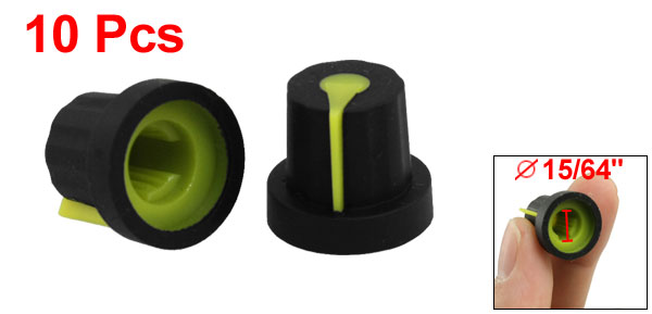 Details10x Rubber Coated Plastic Knurled Grip Potentiometer Knobs Black Yellow  Product Name Potentiometer Control Knob Knob Top Diameter 11mm / 0.43" Knob Base Diameter 16mm / 0.63" Shaft Insert Diameter 6mm / 15/64" Knob Total Height 14.5mm / 0.57" Material Plastic, Rubber Main Color Black, Yellow Weight 13g Package Included 10 x Potentiometer Control Knob